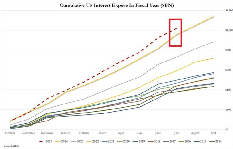 El coste de financiar la deuda pública estadounidense se ha disparado a niveles históricos. En solo los diez primeros meses del año fiscal 2025, el gasto en intereses ha alcanzado 1 billón de dólares, un récord absoluto. Todo apunta a que, por primera vez en la historia, superará los 1,2 billones al cierre del año.