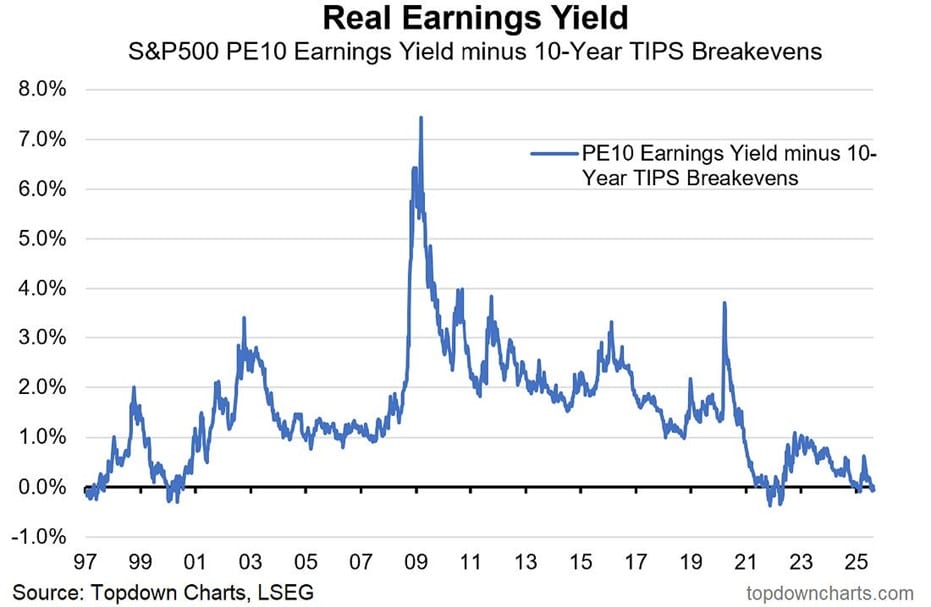 El resultado es claro: hoy esa rentabilidad real está en mínimos históricos, en niveles similares a los de 1997 (antes de la crisis asiática), el año 2000 (burbuja puntocom) o 2021 (pico de la burbuja de estímulos). Momentos que precedieron fuertes episodios de volatilidad en los mercados.