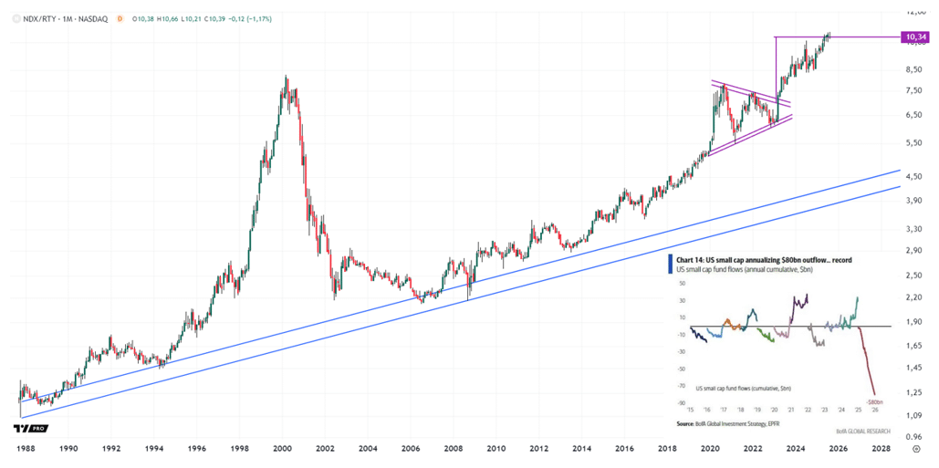 El dinero sigue fluyendo hacia la bolsa, pero se concentra cada vez más en las grandes tecnológicas. El gráfico que compara el Nasdaq 100 (índice que aglutina principalmente al sector tecnológico) frente al Russell 2000 (índice de “small caps” o compañías de pequeña capitalización) muestra una tendencia imparable: desde hace décadas las compañías más grandes superan con creces a las pequeñas, y la brecha se ha acelerado en los últimos años hasta alcanzar nuevos máximos históricos. Hasta aquí todo entraba dentro de lo razonable desde una perspectiva técnica, ya que, tras unos años de consolidación lateral triangular entre 2020 y 2022, el patrón se rompió al alza y el objetivo previsto es el que hemos alcanzado recientemente, tal y como puede verse en el siguiente gráfico.