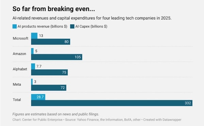 Aun así, la inversión continúa porque la narrativa lo impulsa todo. La idea de que la IA es una carrera geopolítica que Estados Unidos no puede perder crea un respaldo implícito. Los inversores creen que, si algo va mal, habrá apoyo público, incentivos, subsidios o rescates, igual que ocurrió en el sector financiero o en el sector automovilístico en momentos críticos. Esta expectativa reduce la percepción de riesgo y alimenta aún más el ciclo. Pero la brecha cada vez mayor entre el gasto necesario para construir centros de datos de IA y el dinero que realmente generan los productos que funcionan gracias a ellos crea un riesgo importante. Según el Center for Public Enterprise, ‘si se produce una parada repentina en la financiación de nuevos centros de datos, las empresas en situación de financiación Ponzi (con déficits de caja) se verán obligadas a intentar cubrir su posición vendiendo activos’, es decir, provocando ventas forzadas a precios de derribo, lo que ‘probablemente conduciría a un colapso del valor de esos activos.